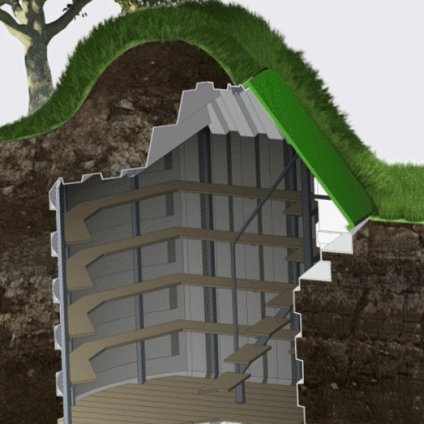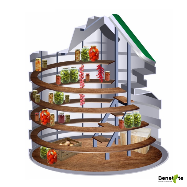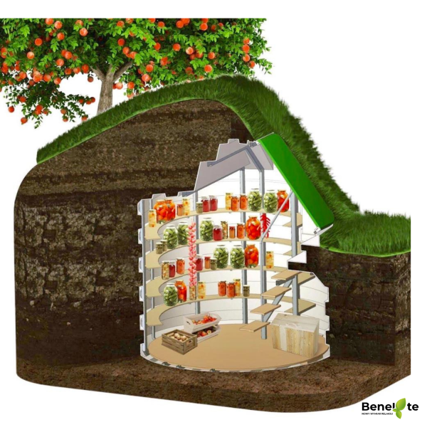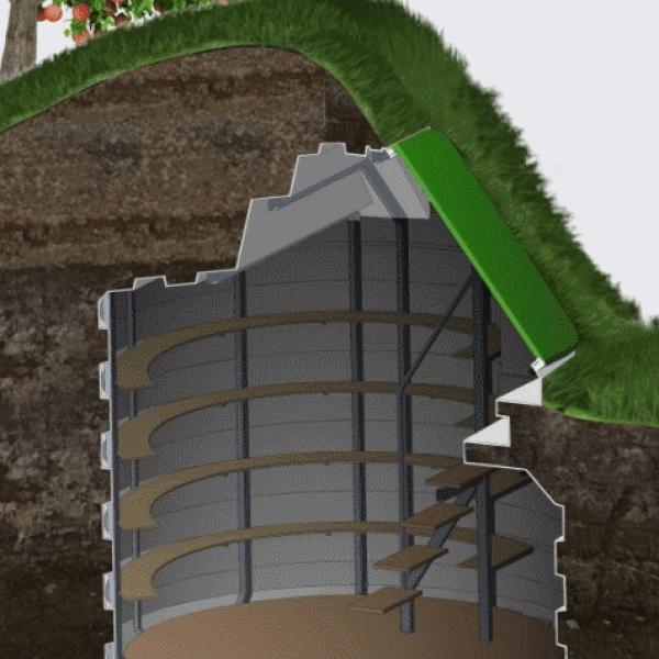 Dzięki ziemnej warstwie izolacji znajdującej się nad EcoPiwniczką w jej wnętrzu zarówno latem, jak i zimą panuje optymalna temperatura do przechowywania żywności.