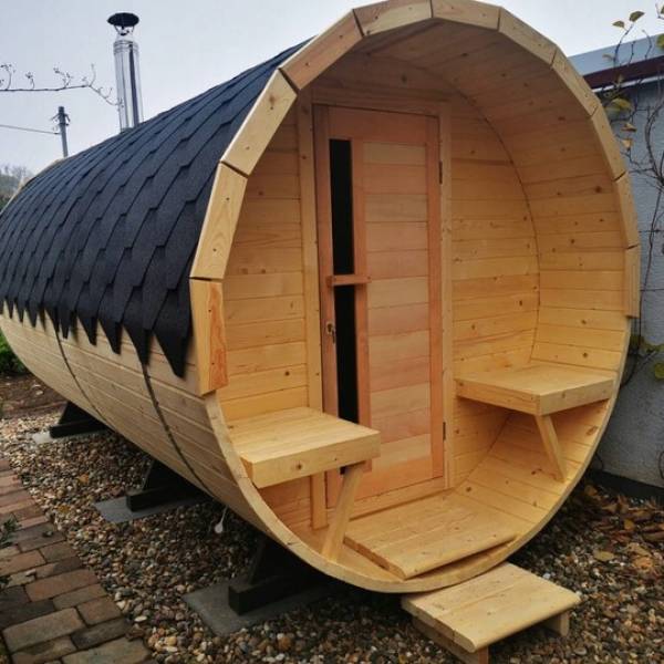 Proponowane przez nas sauny są odpowiednio zabezpieczane i impregnowane. Cała sauna opiera się na solidnej i niezawodnej podstawie wykonanej z drewna konstrukcyjnego. Elementy te zapewniają mocną stabilność całej konstrukcji. Dach jest pokryty wysokiej jakości gontem bitumicznym Shinglas. Sauna zewnętrzna beczka charakteryzuje się lekkością i prostym montażem. Można ją przenosić z jednego miejsca na drugie, zależnie od upodobań użytkowników.